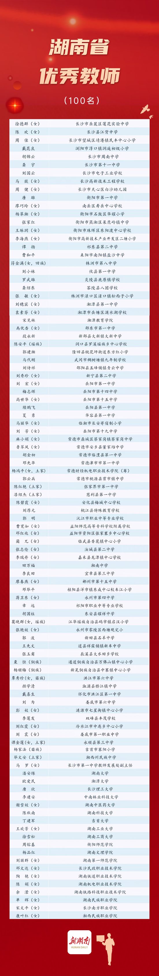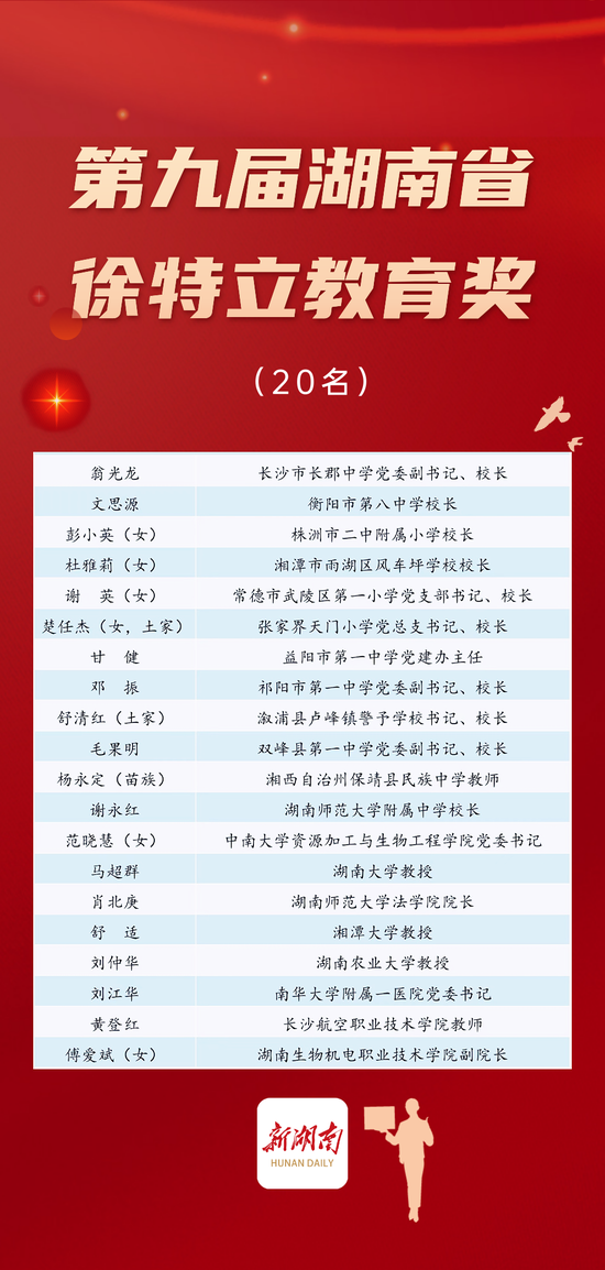 今天下午,2022年湖南省优秀教师表彰暨庆祝第38个教师节大会在长沙举行。会议公布了20名第九届“湖南省徐特立教育奖”获得者、100名2022年“湖南省优秀教师”和20名“湖南省优秀教育工作者”名单。